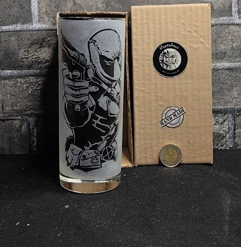 Pahar de sticlă gravat manual cu motivul pistolului Deadpool