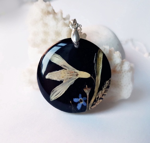 Colier unicat handmade Pandantiv flori naturale primavara Pandantiv ghiocel si albastre medalion botanic cadou Craciun