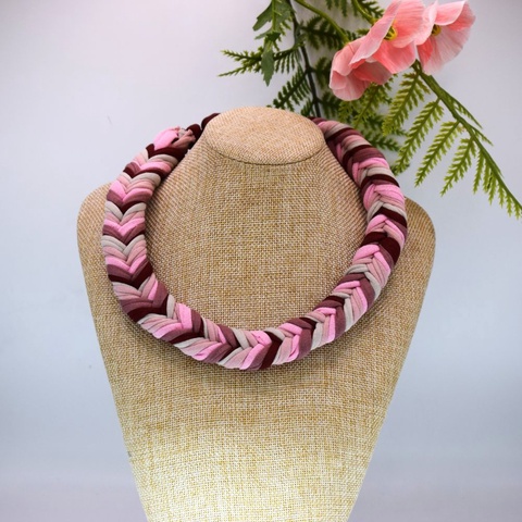 Colier boho din bumbac reciclat, zero waste, impletit, roz-mov