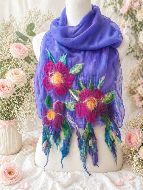 Eșarfă de mătase naturala împaslita cu flori de lana merinos